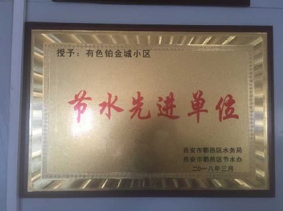 近期,在鄠邑區水務局舉辦“中國水周”啟動儀式上,有色鉑金城小區被授予“節水先進單位”稱號。這一榮譽的獲得,是對有色鉑金城小區在重視水資源保護,積極倡導節約用水方面工作的一大肯定。