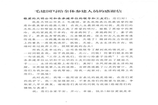 信中指出,神華天明發電公司員工毛建國家人長期患病,妻子又突發嚴重的心臟病,讓原本不富裕的家庭更是雪上加霜。在了解到相關情況后,神華天明項目部負責人高度重視,積極開展愛心捐款活動,為毛建國一家伸出了援助之手,幫助其度過難關。